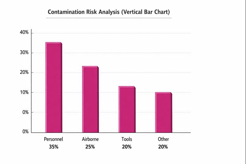 縦棒グラフは、人の移動がクリーンルーム内の相互汚染に最も大きく寄与していることを示しており、適切なガウンとワイプの取り扱いが強調されています。