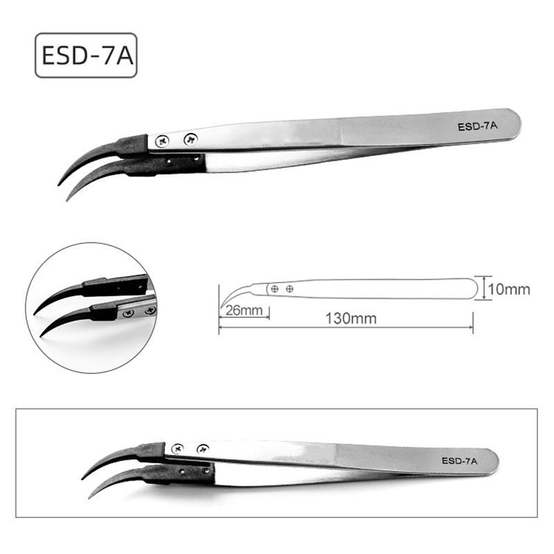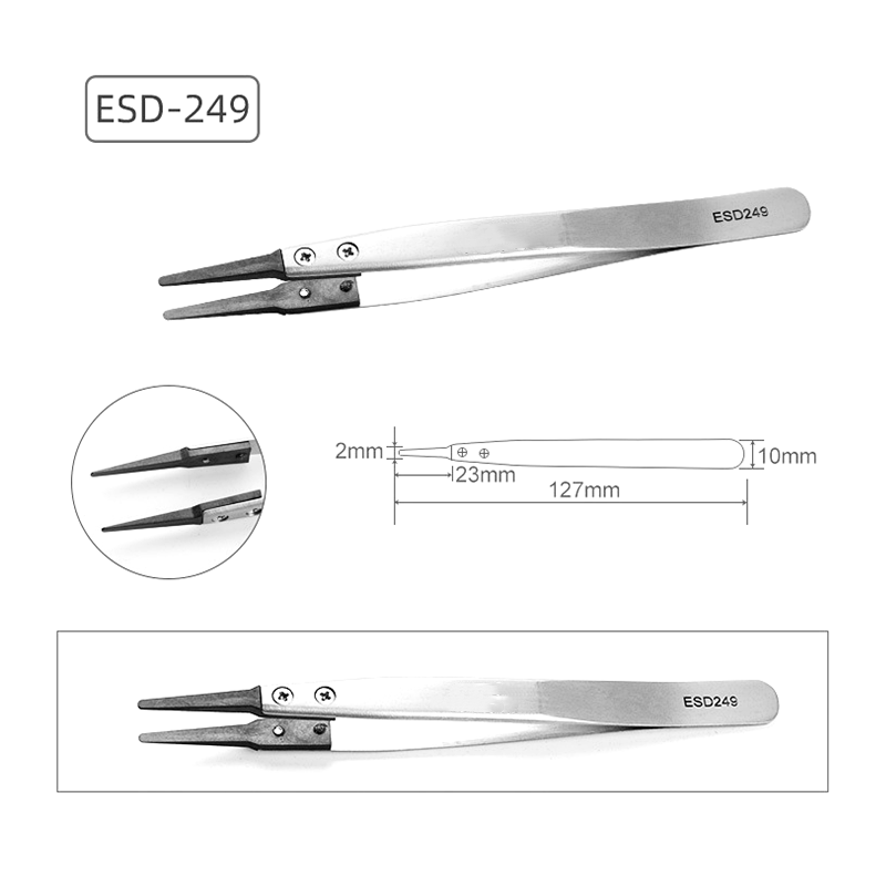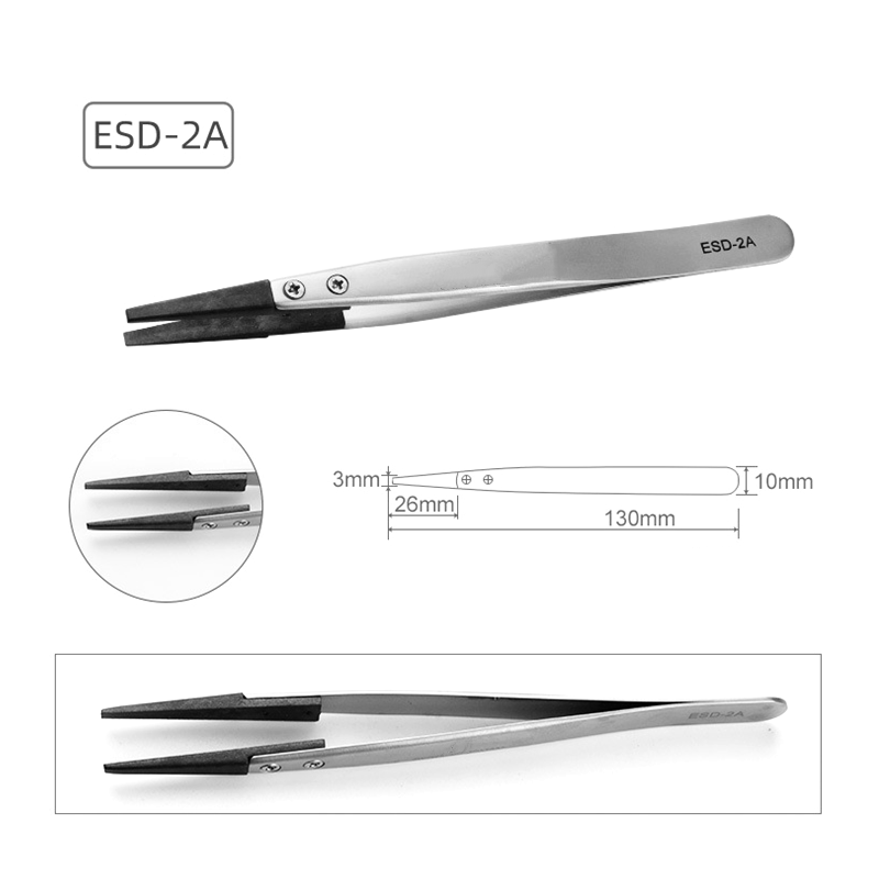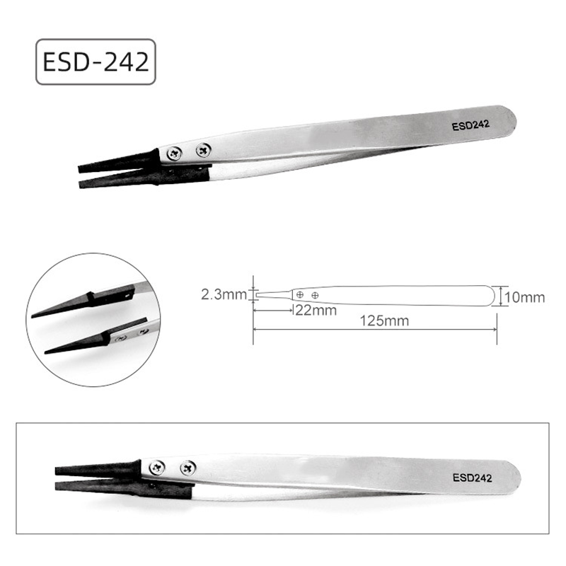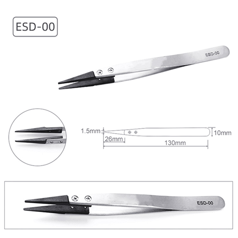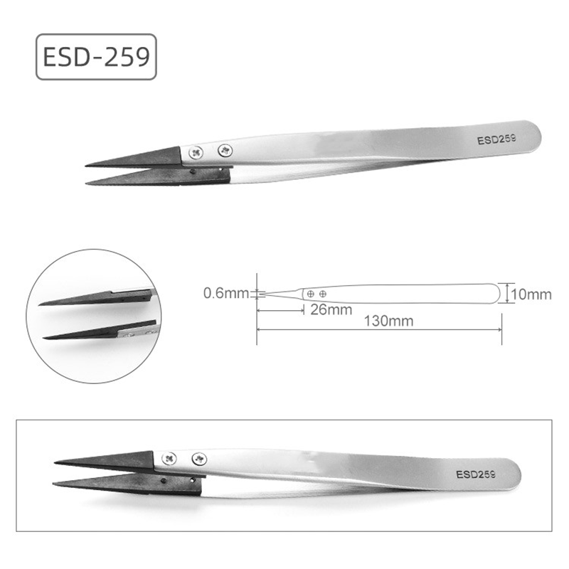 アンティスタティックな交換用ピンセット、ピンセットボディは、輸入されたステンレス鋼、マットマット、厚さ約1.5mmで作られています。ピンセットの頭は、炭素繊維と特別なプラスチックの混合物から作られています。