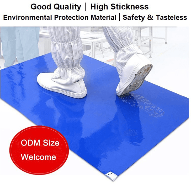 効率的なダスト除去:私たちの粘着マットは、多層低密度ポリエチレン(PE)フィルム材料、合計30層で作られており、それぞれの取り外し可能なフィルムは高粘度コーティングで均等にコーティングされています。各層には一貫した接着があり、それは、底、粒子、汚れを靴底、車輪、その他の物体に効果的に捕獲し、汚染物質の移動を最小限に抑えることができます。